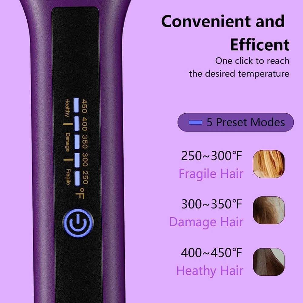 5 Adjustable Temps & Temp-Memory: 5 Temps Options-250/300/350/400/450°F, temperature control making it less damaging to hair. For every next use, the temperature memory function enables auto heat up to the exact temperature at which you used the straightener last time, saving more time to make your desired hairstyle.