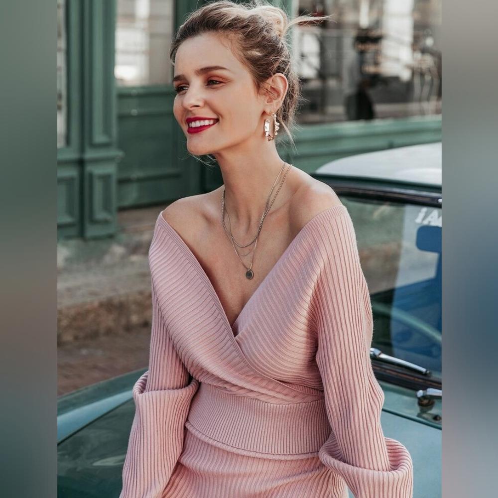 Off Shoulder Surplice Neck Sweater & Skirt Set