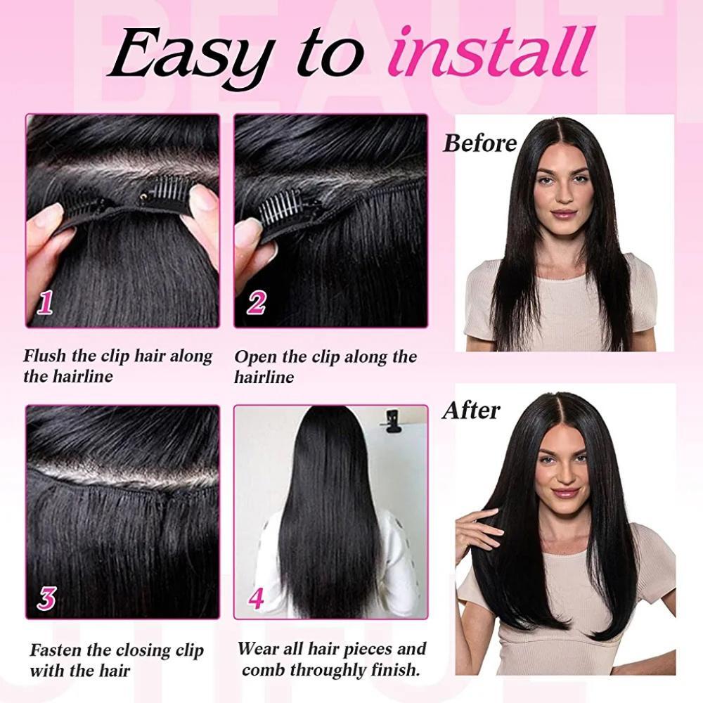 【Clip in Hair Extensions Type】: human hair Extensions 60g-75g/8pcs clips per set. Recommend: use 1-2 packs for fine hair, 2-3 packs if you like heavy volume, easy installation and removal.